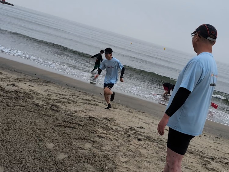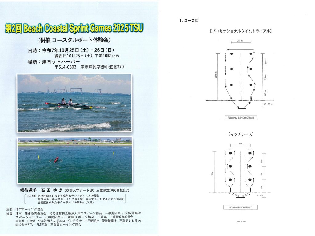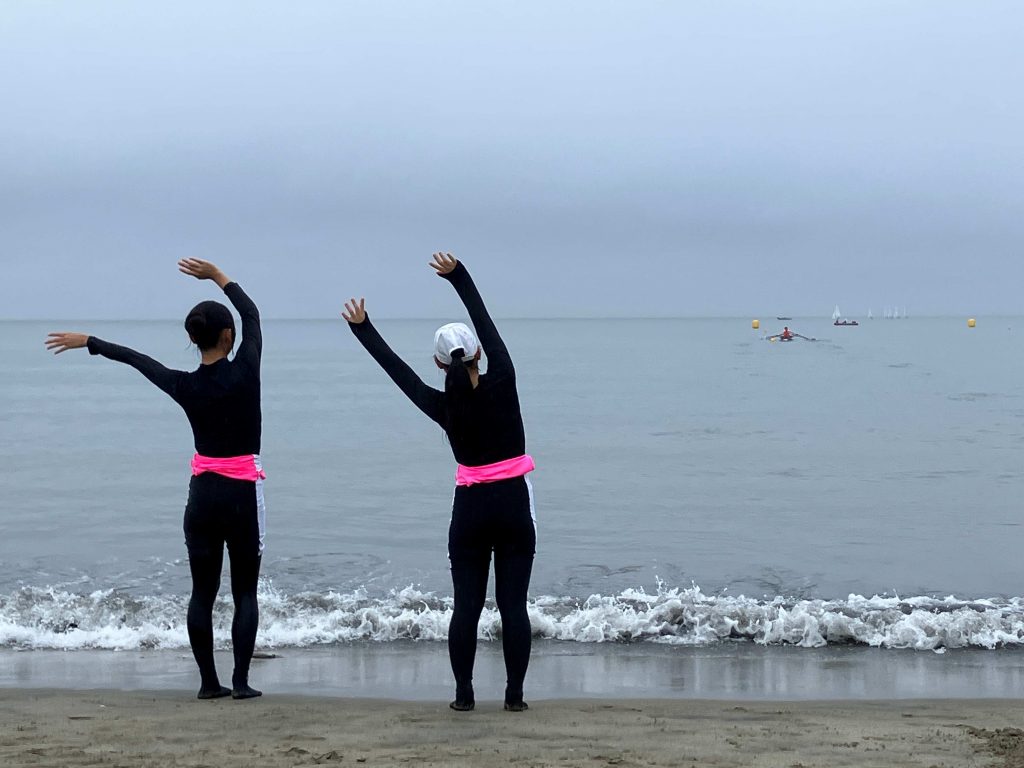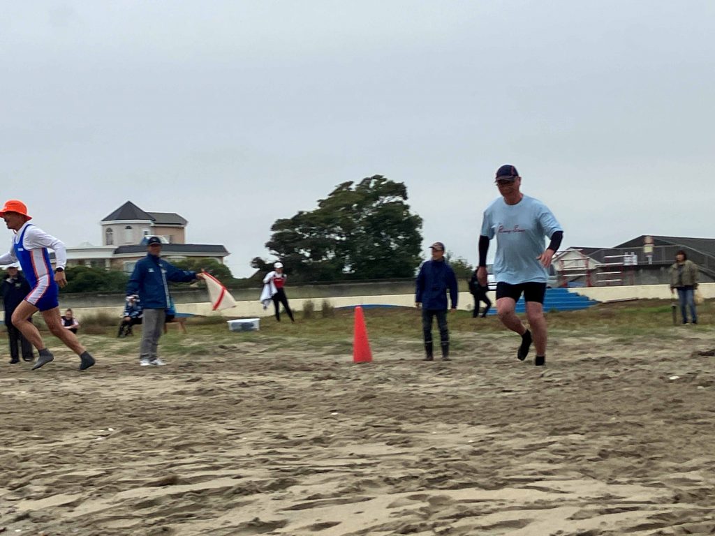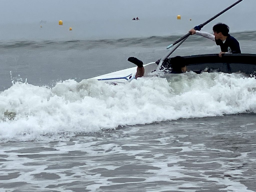 このビーチスプリント・ローイングという競技は、その名の通り砂浜のスタートラインから波打ち際まで全力疾走し、ボートに乗り込んだらブイを定められた順番に周回して、折り返し浜辺に戻ったら再び砂浜をダッシュしてゴールへ飛び込みます。走力とローイングのパワーはもちろん、波や潮の流れ、風などを把握しつつ、艇を最短距離で進める経験値と技術が求められるのがこの競技。しかし、そんな事には気づきもせず、我々は体力勝負と信じて本番を迎えました。