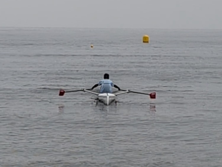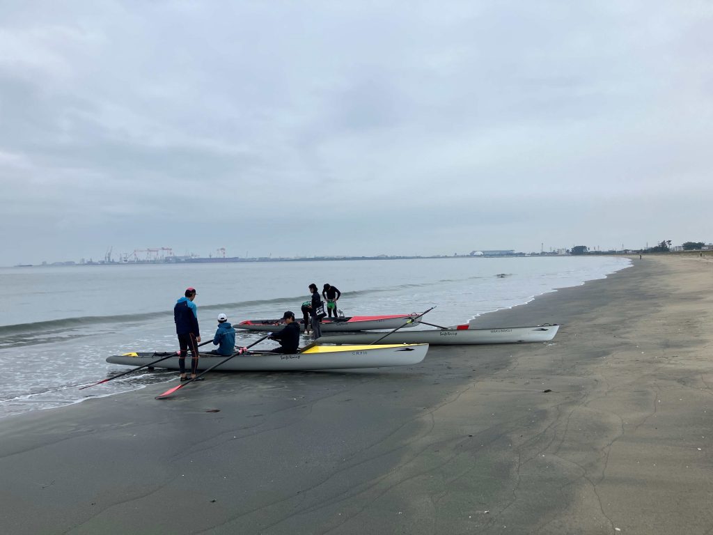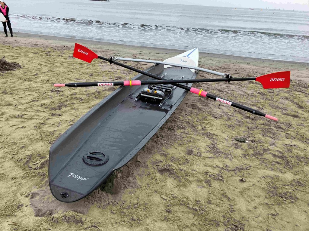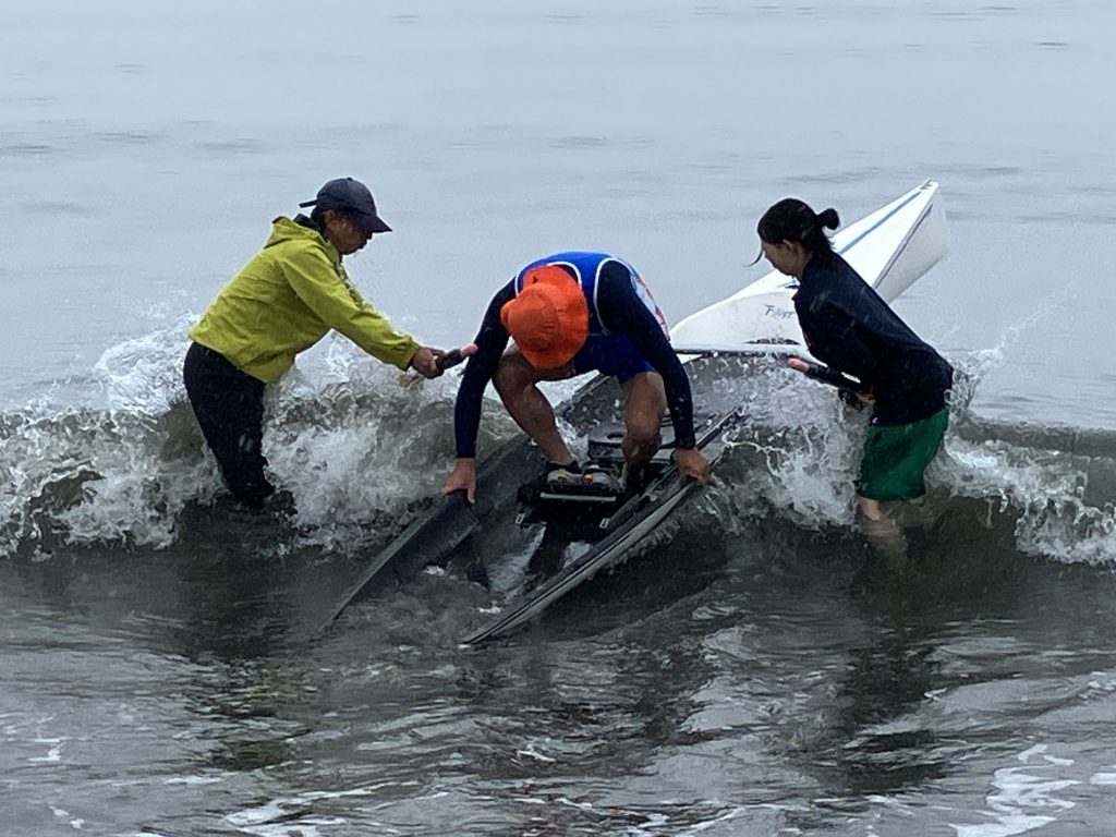 しかし、そんな悩みを解決してくれるコースタルという艇が登場しました。グラスファイバーやカーボンを使った艇は、剛性が高く安定性を重視した設計のおかげで安全に漕ぐことができます。試しにこの艇に乗らないかというお誘いと、ついでにレースも出ませんかという後輩の提案にすっかり心を奪われた私は、ホイホイと試乗に向かいました。ちなみに2028年のロサンゼルスオリンピックでは、この艇を使ったビーチスプリント・ローイングという競技が正式に採用され、今後注目を浴びることは間違いありません。それなら競技人口が少ない今こそ、我々のメダル獲得も夢ではない。こんな邪(よこしま)な思いを抱きつつ、実際に漕いでみると実に面白い。バランスが良く小回りが利き、思った所へ風を切ってスイスイ進みます。これぞまさに人馬、ではなく人艇一体。これならレースも大丈夫と、根拠のない自信がどんどん膨らみます。しかし世の中、そんなに甘いわけがありません。