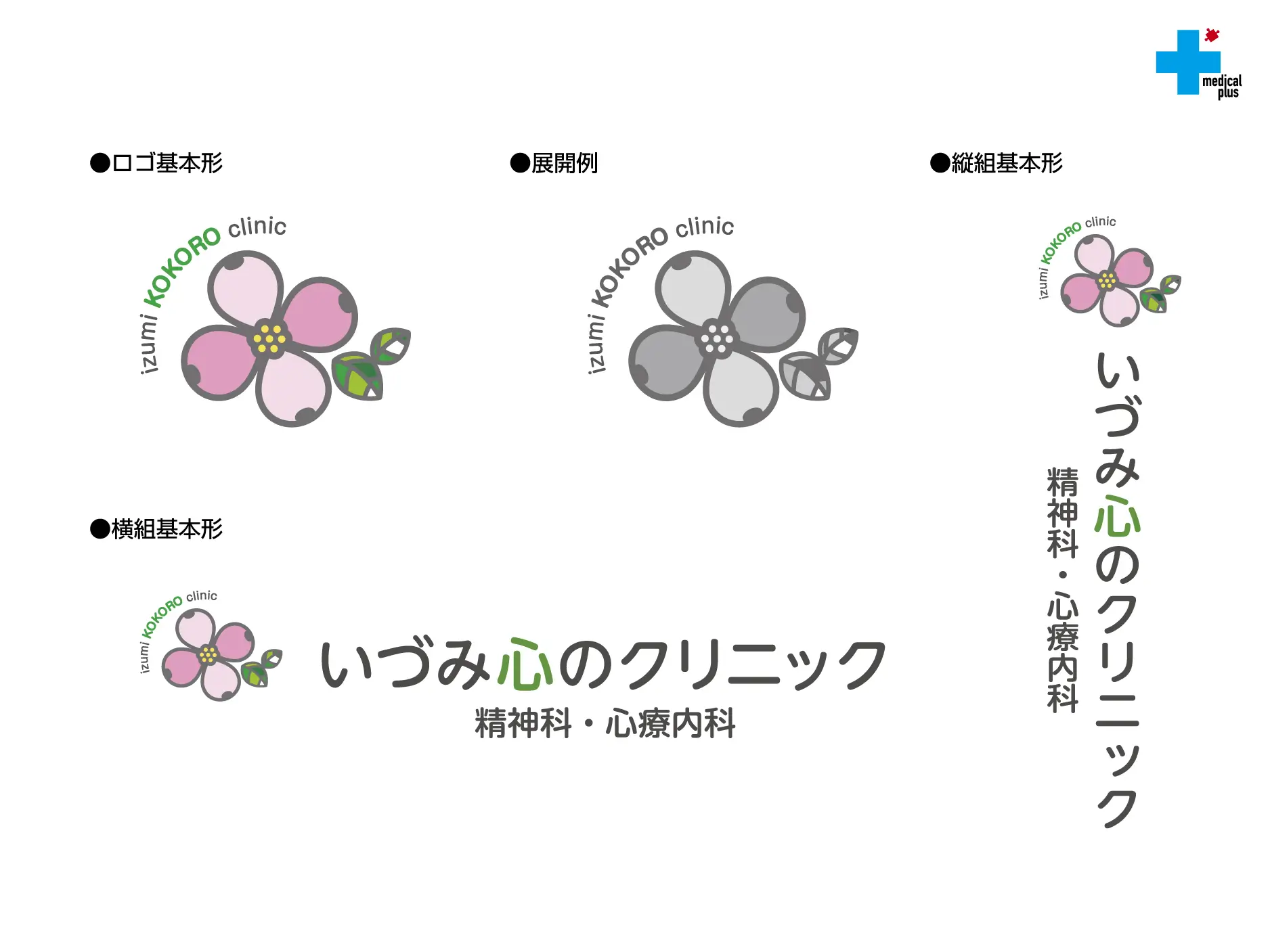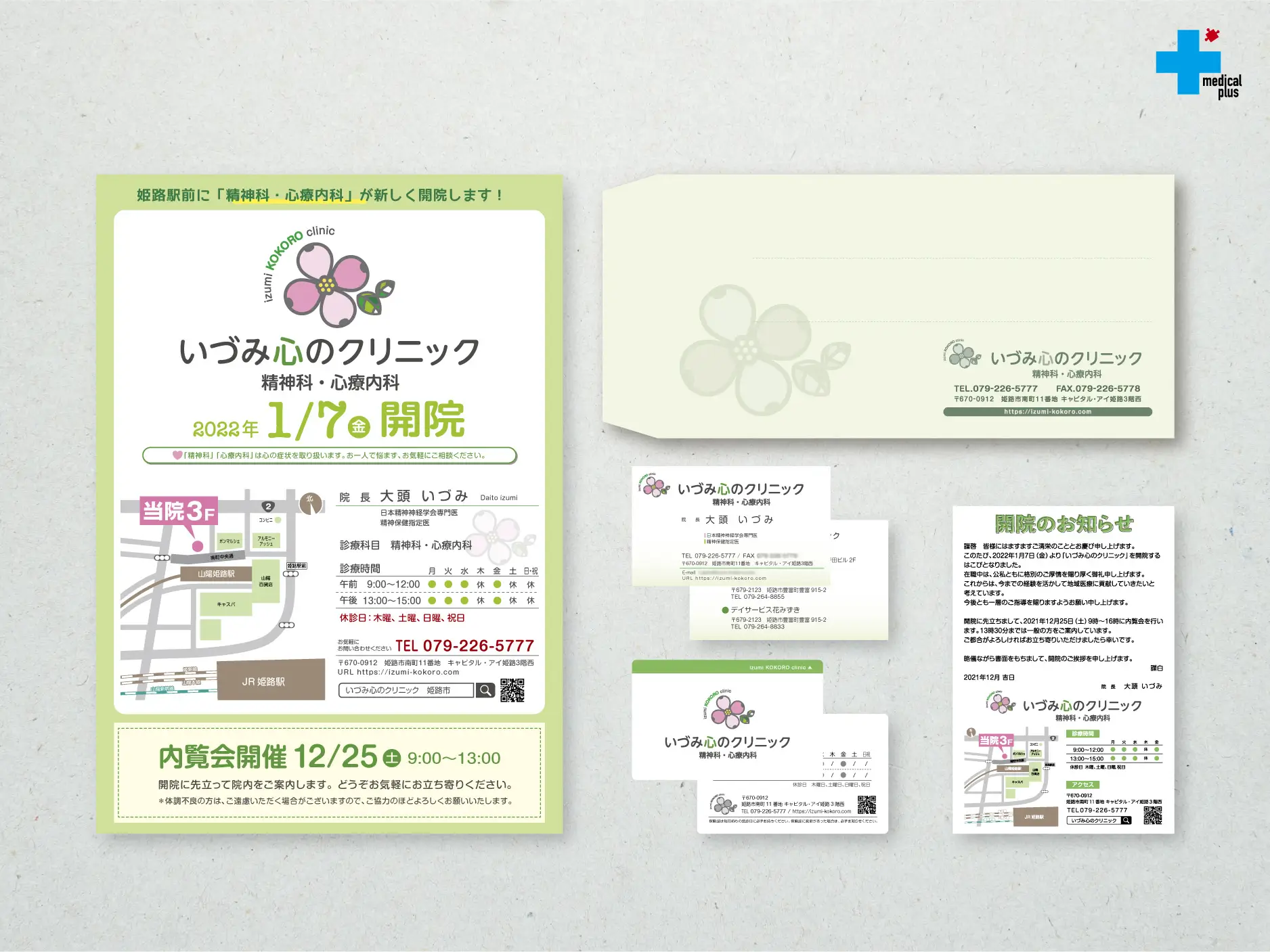 ロゴ、受付背面サイン、室名サイン、テナントサイン、誘導サイン、名刺、A4チラシ、ハガキサイズチラシ、封筒、診察券、挨拶ハガキ