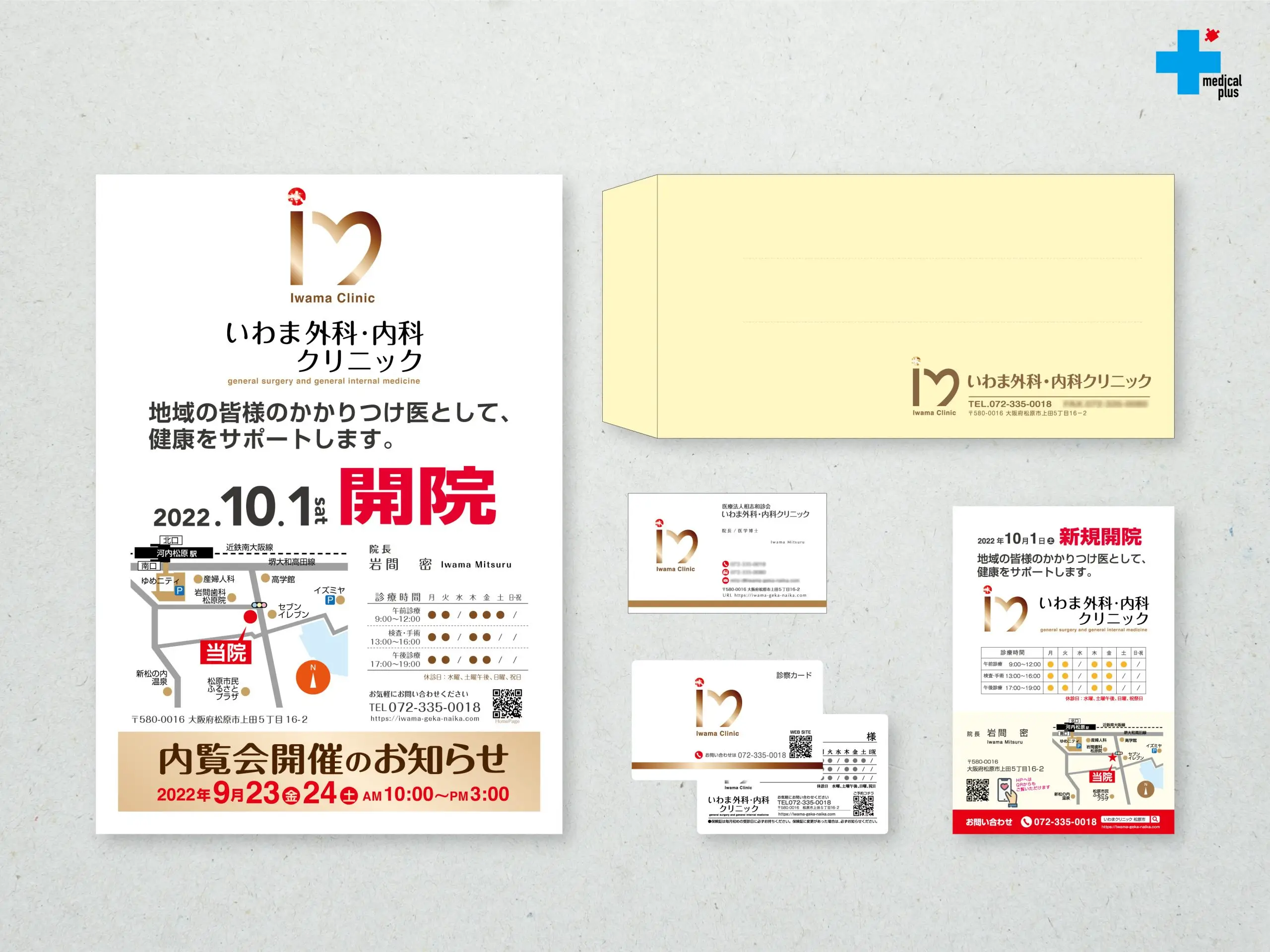 ロゴ、室名サイン、自動ドア院外表示、切文字サイン、名刺、A4チラシ、ハガキサイズチラシ、封筒、診察券、ゴム印