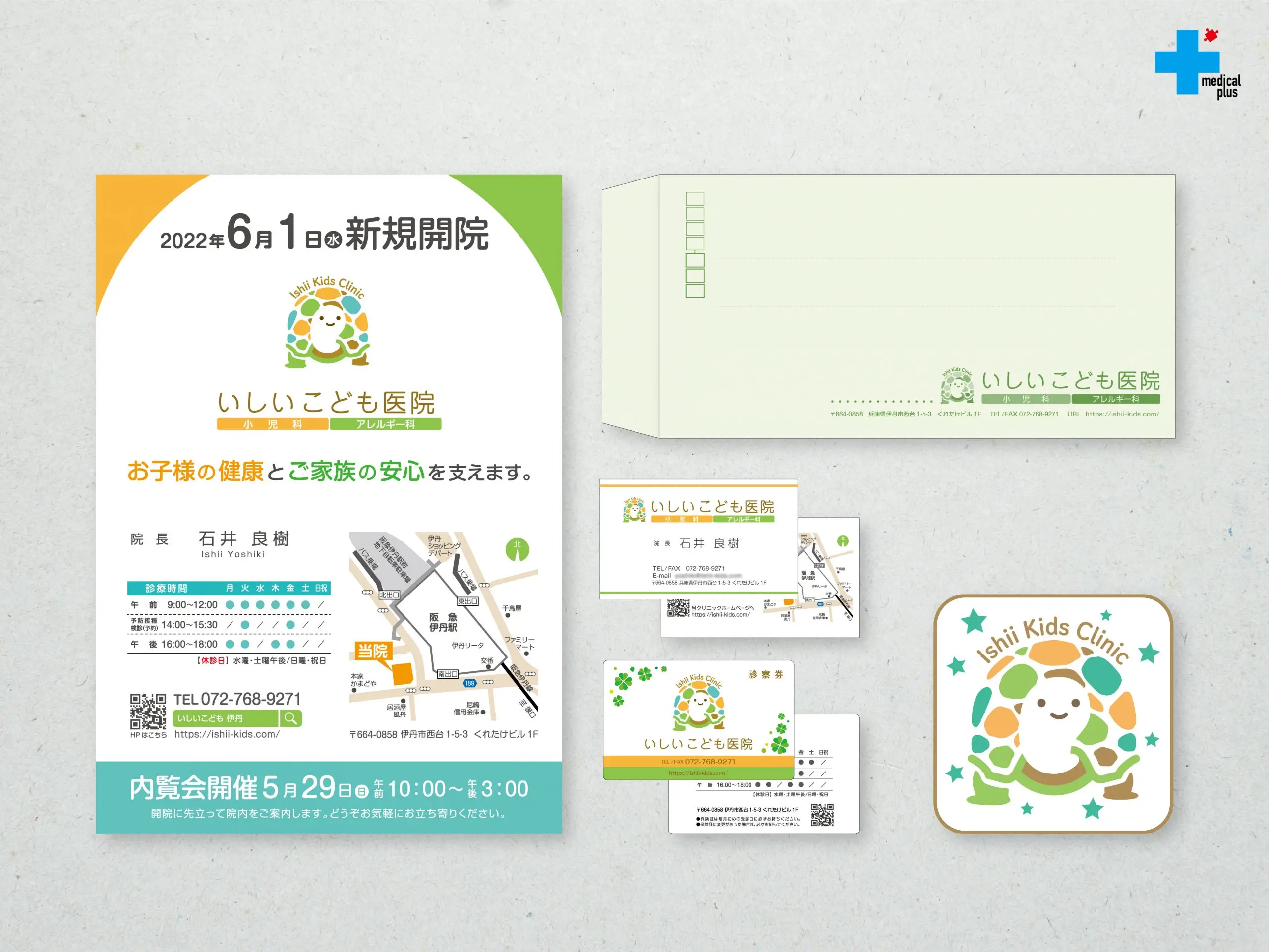 ロゴ、名刺、A4チラシ、名刺サイズチラシ、封筒、診察券、ノベルティ、ゴム印、室名サイン、ファサードサイン