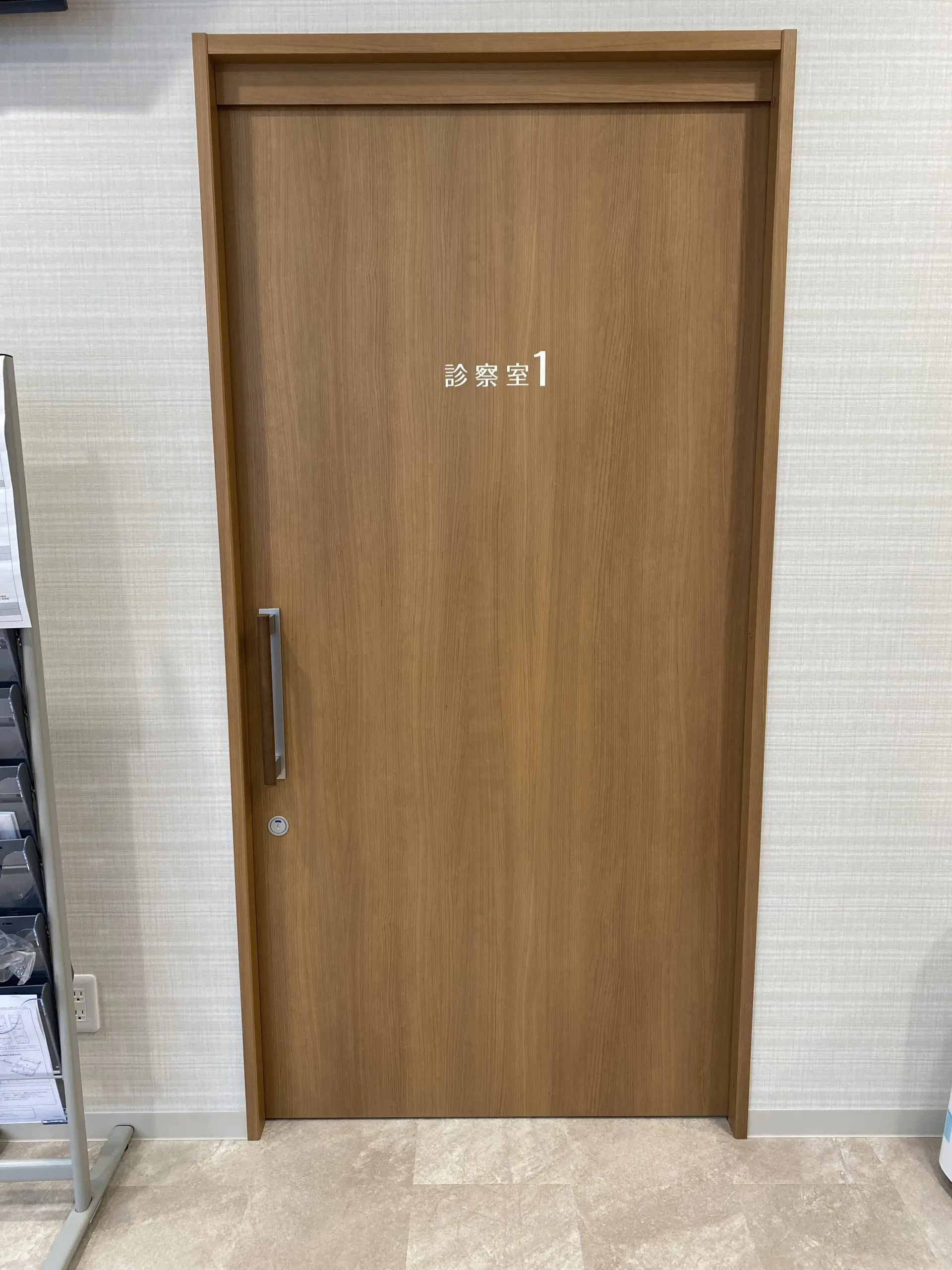 ロゴ、室名サイン、自動ドア院外表示、受付背面サイン、ガラスサイン、名刺、A4チラシ、挨拶状、封筒、診察券、ゴム印