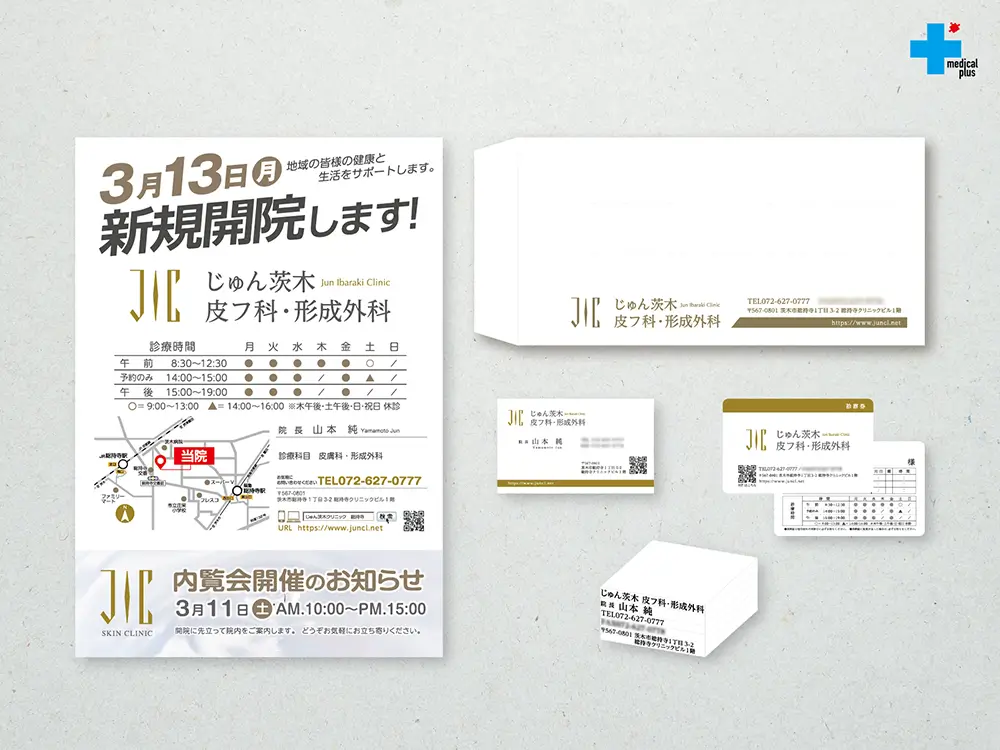 デジタルサイネージ、駅貼りポスター、ガラスサイン、自動ドアサイン、室名サイン、ロゴ、診察券、封筒、折込チラシ、ゴム印