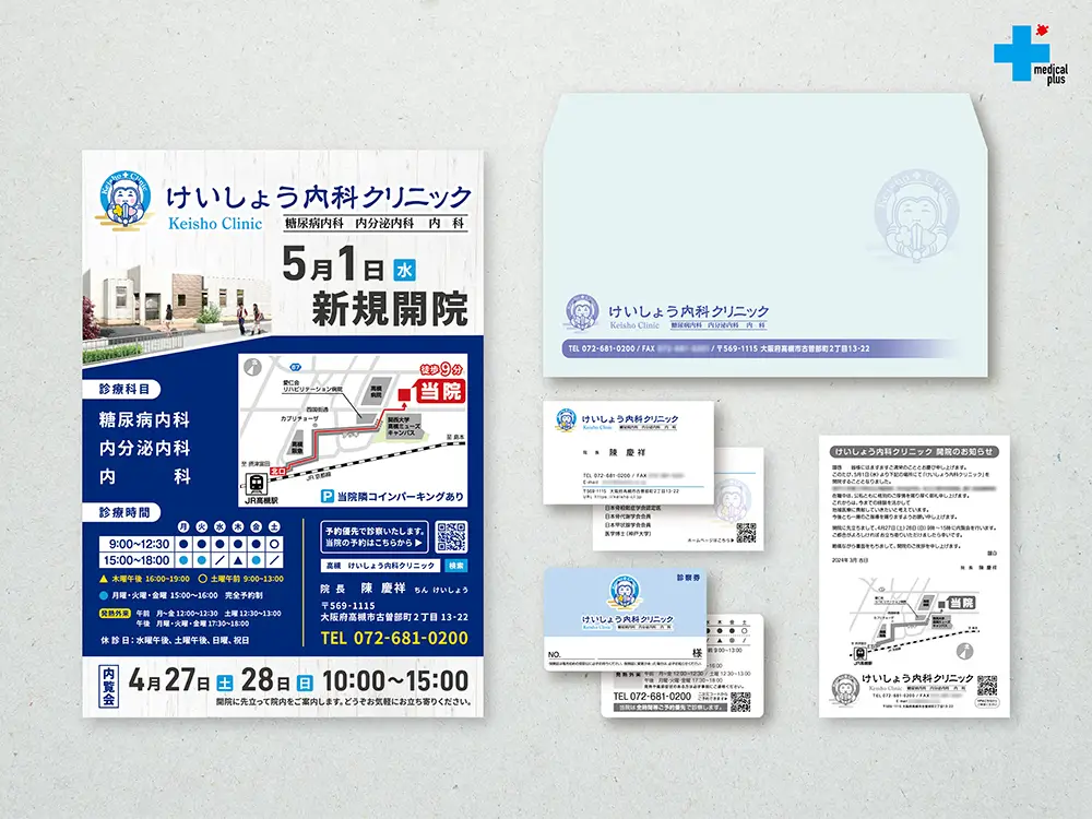自動ドア、室名サイン、受付背面サイン、壁面切文字サイン、壁面パネルサイン、ロゴ、挨拶状、診察券、封筒、チラシ、名刺、三つ折りリーフレット