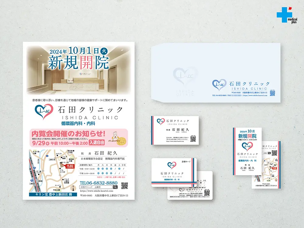 A4チラシ、名刺、診察券、封筒、ゴム印、開院告知カード、ノベルティ、受付背面サイン、室名サイン、自動ドアサイン