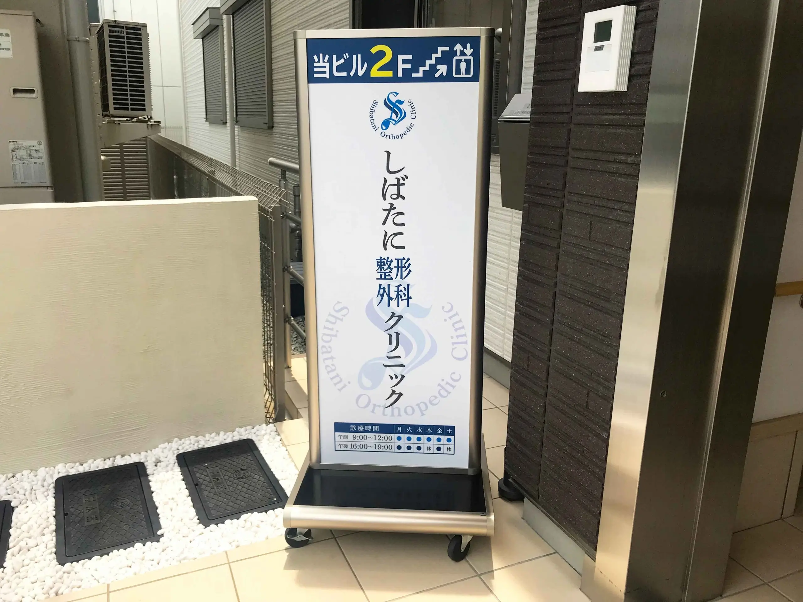 ガラスシート右側の半透明シートですが、ロゴと英文字を切り抜き加工しております。開業後、ニーズにお答えし、1階入り口部にスタンド看板を設置しました。