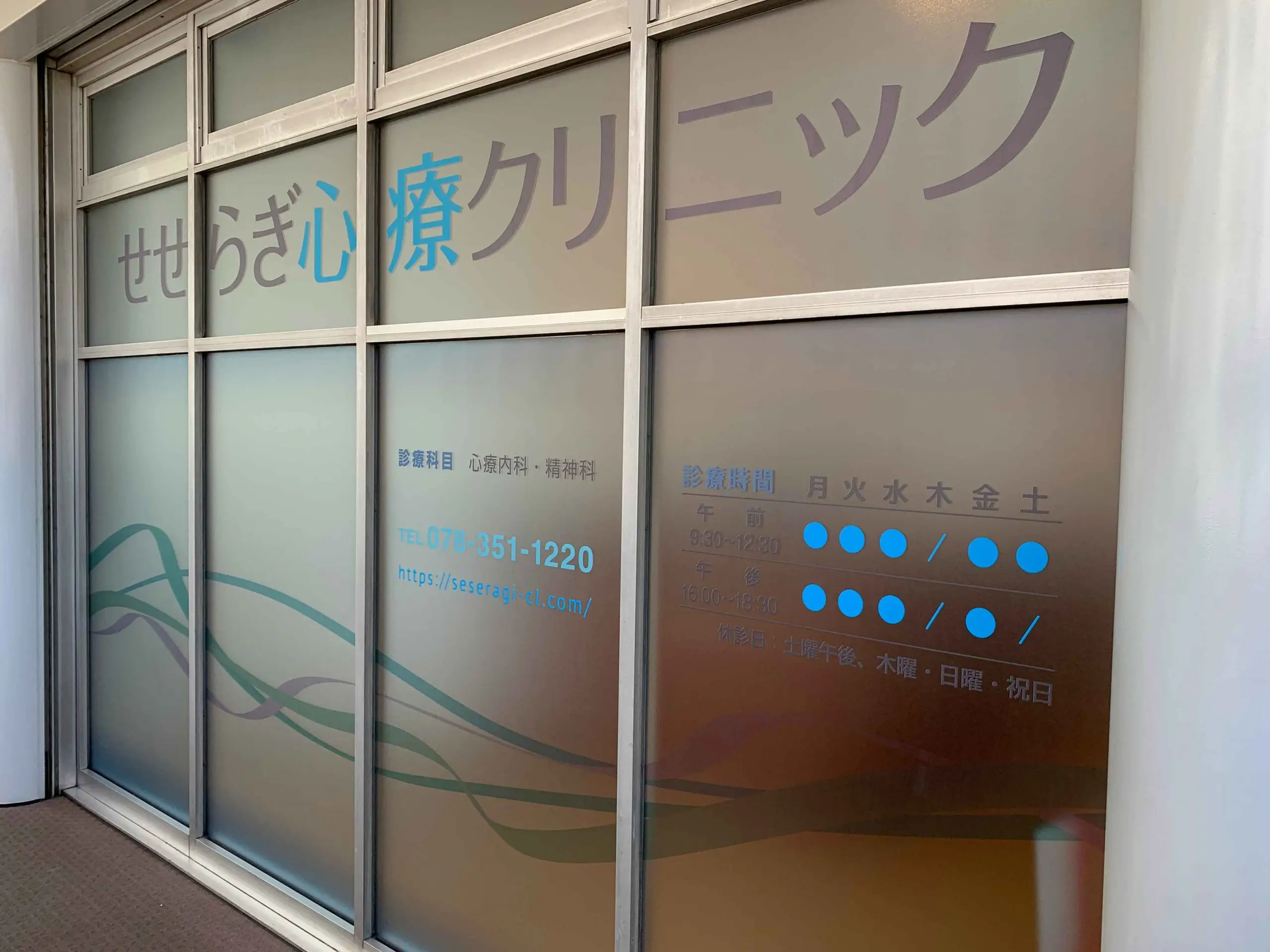 自動ドア入り口部は壁面サインが見えるようにガラスシートを貼りました。 ガラスシートは淡いブルーのグラデーション加工とデザインでせせらぎをイメージしております。